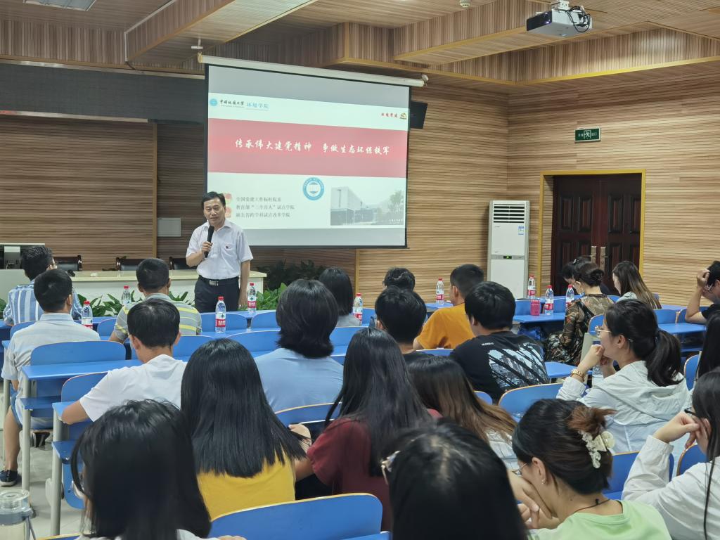 秭归实习-党史学习教育第三讲在秭归产学研基地三楼阶梯教室进行,在站实习师生参加,队长罗明明主持。院党委书记李素矿以“传承伟大建党精神,争做生态环保铁军”为题领学。