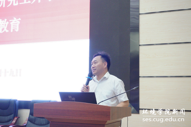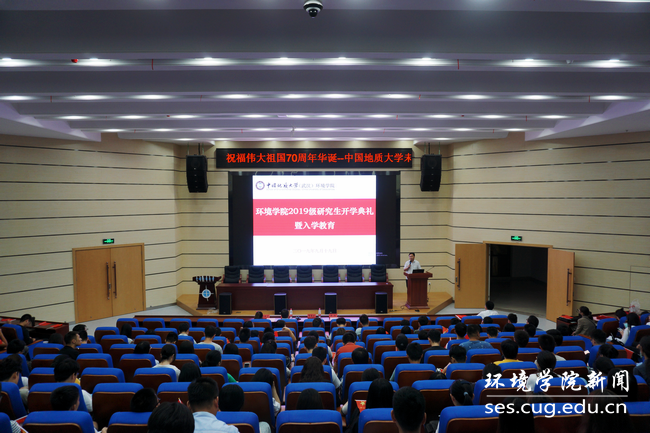 向全体2019级研究生新生表示热烈的欢迎。他寄语全体新生:一是读书。用古人“万般皆下品,唯有读书高”“书中自有黄金屋,书中自有颜如玉”的优秀文化传统,树立“为中华之崛起而读书”的理想信念,多读书、读好书;二是研究。要体现研究生的身份和价值,涵养创新意识、创新精神,敢于在未知领域探索科学的真谛与奥秘;三是博爱。要有大爱情怀,在培育爱、激发爱、传播爱中,涵养爱党爱国爱家爱校爱学爱习的品格品行品味;四是恒心,要不忘初心,守住初心,持之以恒。他强调,全院正在开展“不忘初心、牢记使命”主题教育,全体研究生党员要充分发挥先锋模范带头作用,团结全体同学一道,做品德高尚、基础厚实、专业精神、知行合一的地大人,做担当民族复兴大任、红专能优的新时代生态环保铁军。