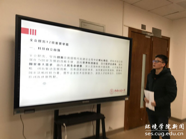 2018级学硕一班硕士研究生党支部晏智伟同志领学《中国共产党第十九届中央委员会第五次全体会议公报》的内容。本次全会,中央委员会总书记习近平作重要讲话,全会听取和讨论了习近平受中央政治局委托作的工作报告,全会审议通过了《中共中央关于制定国民经济和社会发展第十四个五年规划和二〇三五年远景目标的建议》。晏智伟同志介绍到,党的十九届五中全会是在“两个一百年”奋斗目标的历史交汇点,在即将实现第一个百年奋斗目标,开启全面建设社会主义现代化强国新征程的时刻召开的一次十分重要的会议,全党全国各族人民要紧密团结在以习近平同志为核心的党中央周围,同心同德,顽强奋斗,夺取全面建设社会主义现代化国家新胜利。