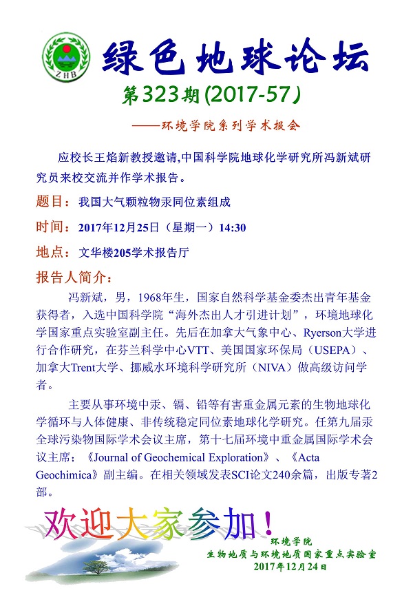 绿色地球论坛第323期(2017-57)——91短视频 系列学术报告会 题目:我国大气颗粒物汞同位素组成 时间:2017年12月25日(星期一)下午14:30 地点:文华楼205学术报告厅