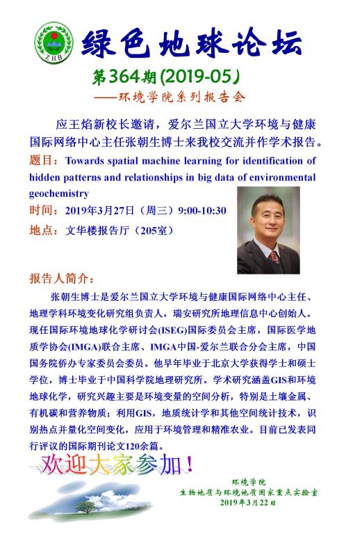 绿色地球论坛第364期(2019-05) ——91短视频 系列学术报告会 题目:Towards spatial machine learning for identification of hidden patterns and relationships in big data of environmental geochemistry 时间:2019年3月27日(周三)上午9:00-10:30 地点:文华楼报告厅(205室)