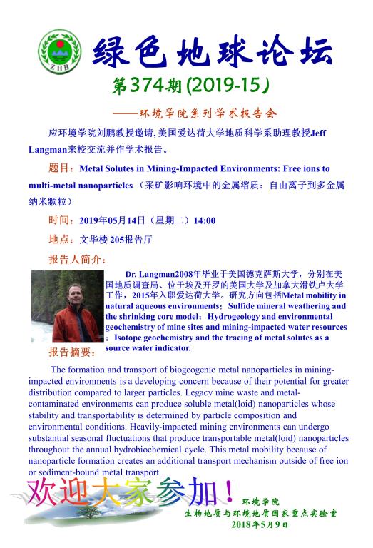 题目: Metal Solutes in Mining-Impacted Environments: Free ions to multi-metal nanoparticles 采矿影响环境中的金属溶质:自由离子到多金属纳米颗粒 时间:2019年5月14日(星期二)下午14:00 地点:文华楼205报告厅